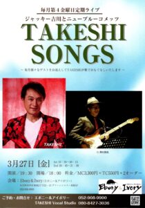 2023年11月3日(祝・金)を第一弾として、2024年1月以降毎月1回様々なゲストをお招きして「TAKESHI」がご来場の皆さまをおもてなしいたします。